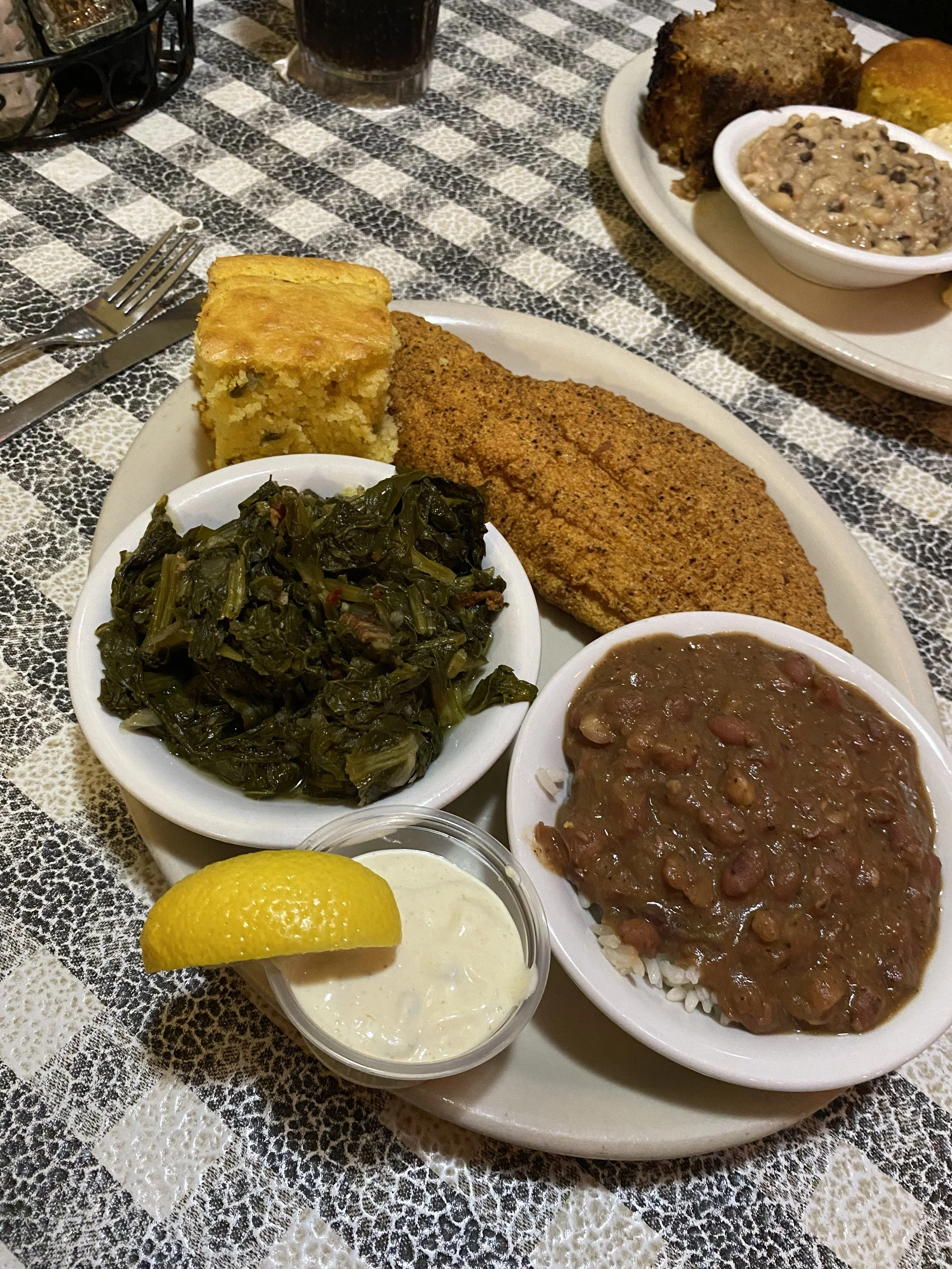 Order notes: Southern fried catfish, cornbread, turnip greens, red beans and rice, mac n cheese, purple hull peas.